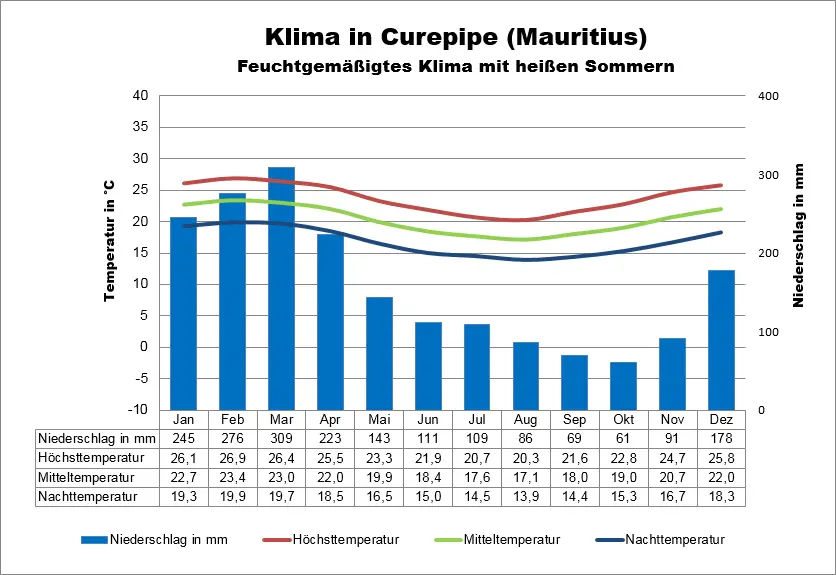 Der feuchte und warme Südsommer von November bis April geht mit heftigen Niederschlägen einher. Die durchschnittlichen Temperaturen betragen in diesen Monaten zwischen 25 und 30°C. In der Spitze werden 33-35 Grad im Schatten gemessen. Auch die Nächte bringen kaum Abkühlung. Während dieser Zeit ziehen immer wieder tropische Wirbelstürme oder deren Ausläufer über Mauritius hinweg.