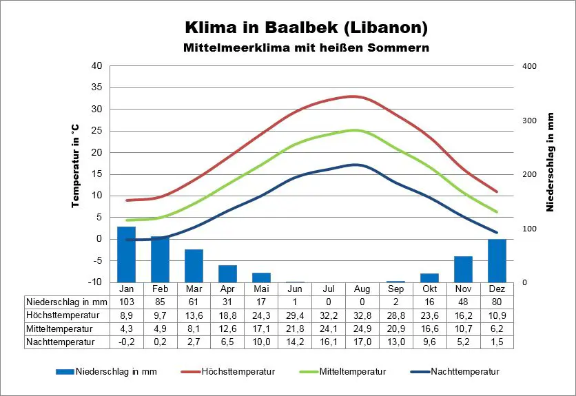 In der Küstenregion herrscht mediterranes Klima. Es zeichnet sich durch trockene, warme bis heiße Sommer mit einer hohen Luftfeuchtigkeit sowie milde, feuchte, teilweise sogar richtig verregnete Winter aus. In der Hauptstadt Beirut liegt die Jahresmitteltemperatur bei 20 Grad. Die Temperaturen erreichen im Januar durchschnittlich 13°C und im Juli und August etwa 28°C. Tagsüber werden im Winter im Mittel 18 Grad und im Sommer mehr als 30 Grad gemessen.