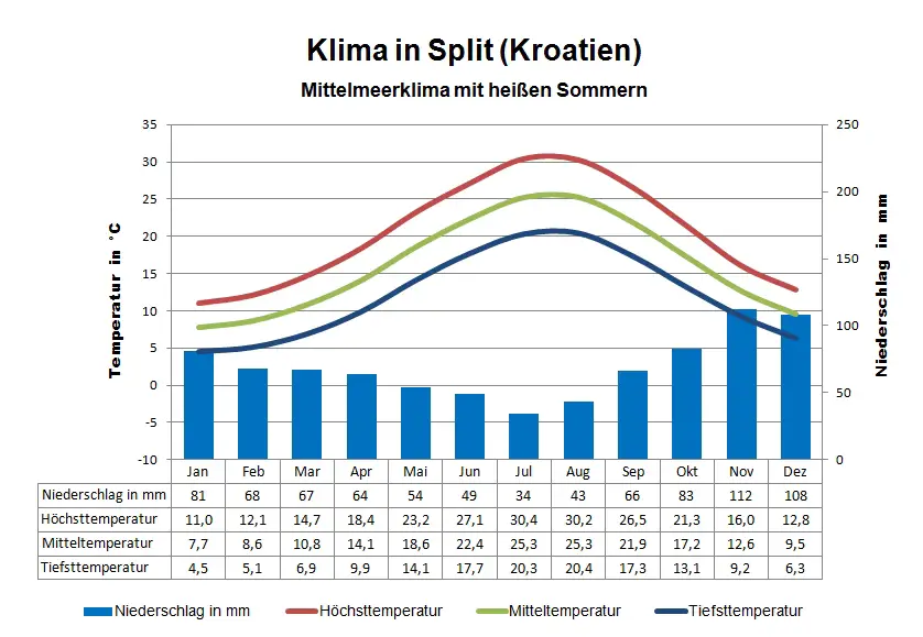 In Dalmatien entlang der Adria herrscht das typische mediterrane Klima mit milden, regenreichen Wintern und warmen, trockenen, sonnigen Sommermonaten. Durch das im Osten anschließende Dinarische Gebirge ist die Küste ganzjährig vor Kaltlufteinbrüchen aus Osteuropa gut geschützt.
